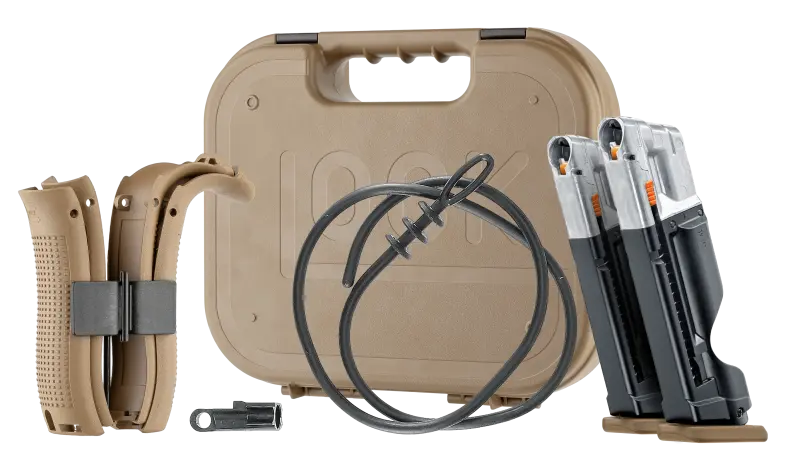 Livré en mallette Glock avec 2 chargeurs, 4 dos de poignées, un cordon de nettoyage et une attache dragonne.