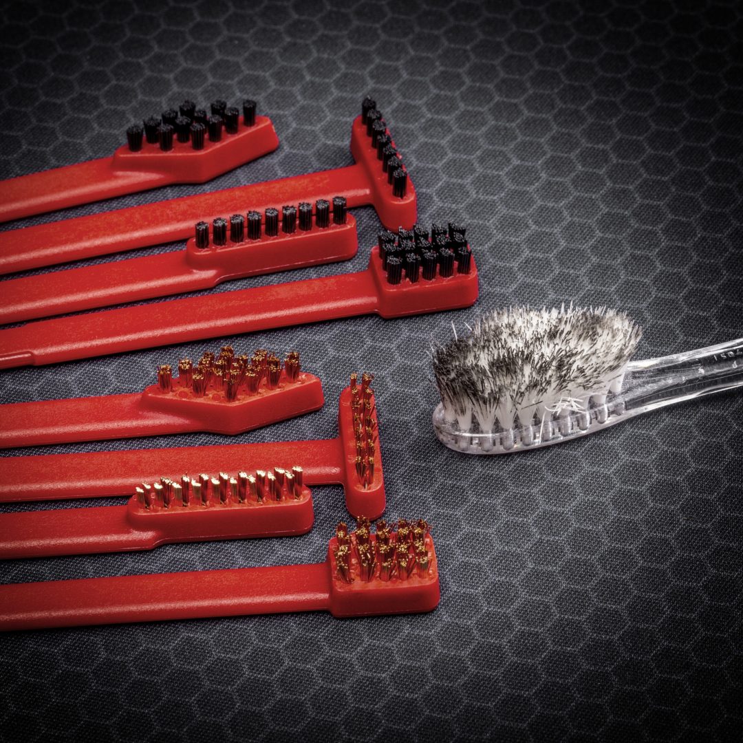 Conçu dès le départ pour faire un travail de nettoyage meilleur et plus rapide des pistolets. Les micro-poils restent rigides sous pression, offrant une puissance de récurage supérieure. Quatre formes de brosses uniques avec grattoirs intégrés sont conçues pour nettoyer spécifiquement les surfaces intérieures et extérieures difficiles d’accès où le carbone et la crasse s’accumulent.